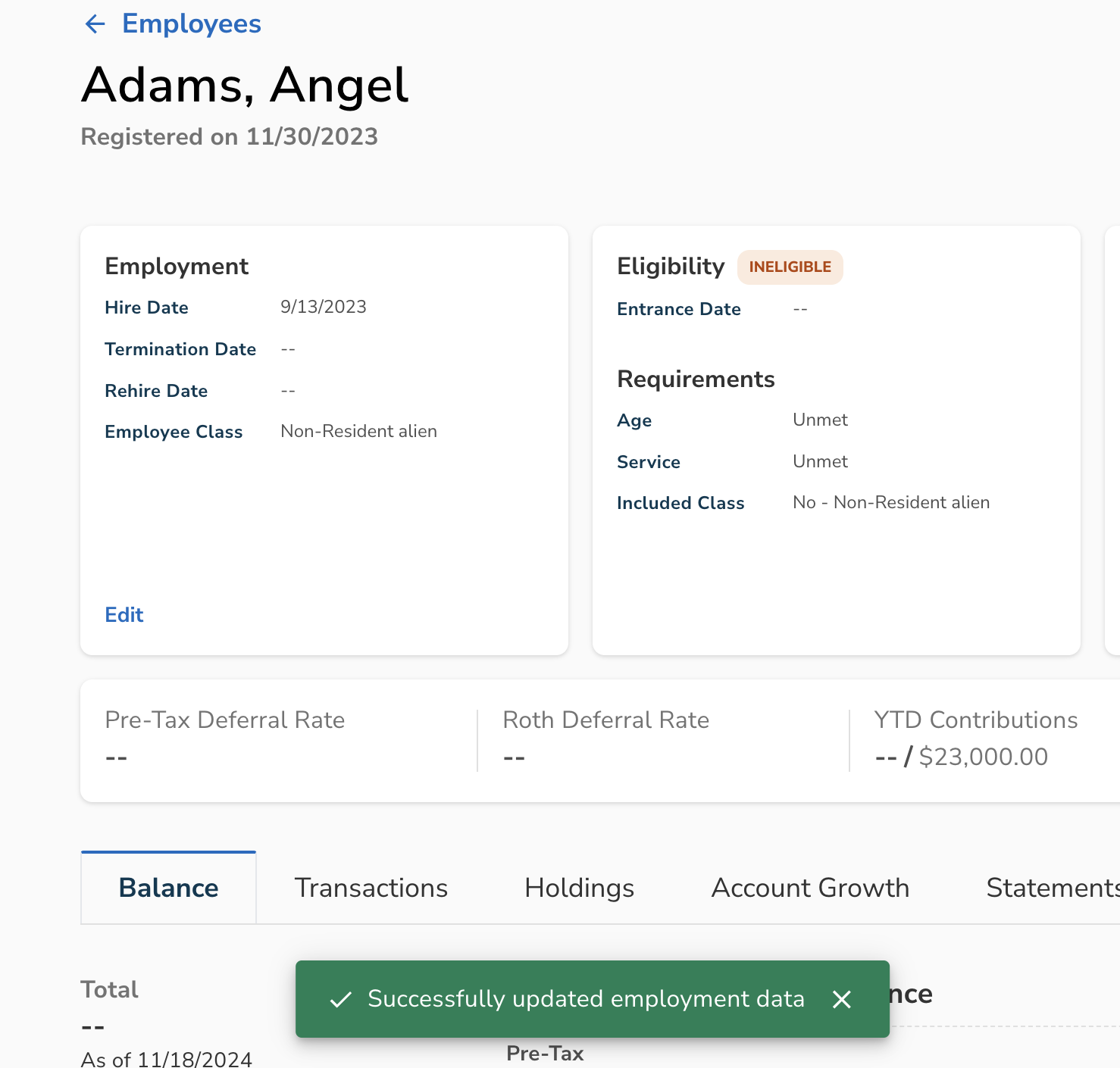 - Once you have clicked Save, you will be brought to the employee’s page again. If you made any changes, you will see a success message at the bottom of the page and updates will be reflected here. Relevant changes will also be reflected on the “Employees” page of your J.P. Morgan portal.