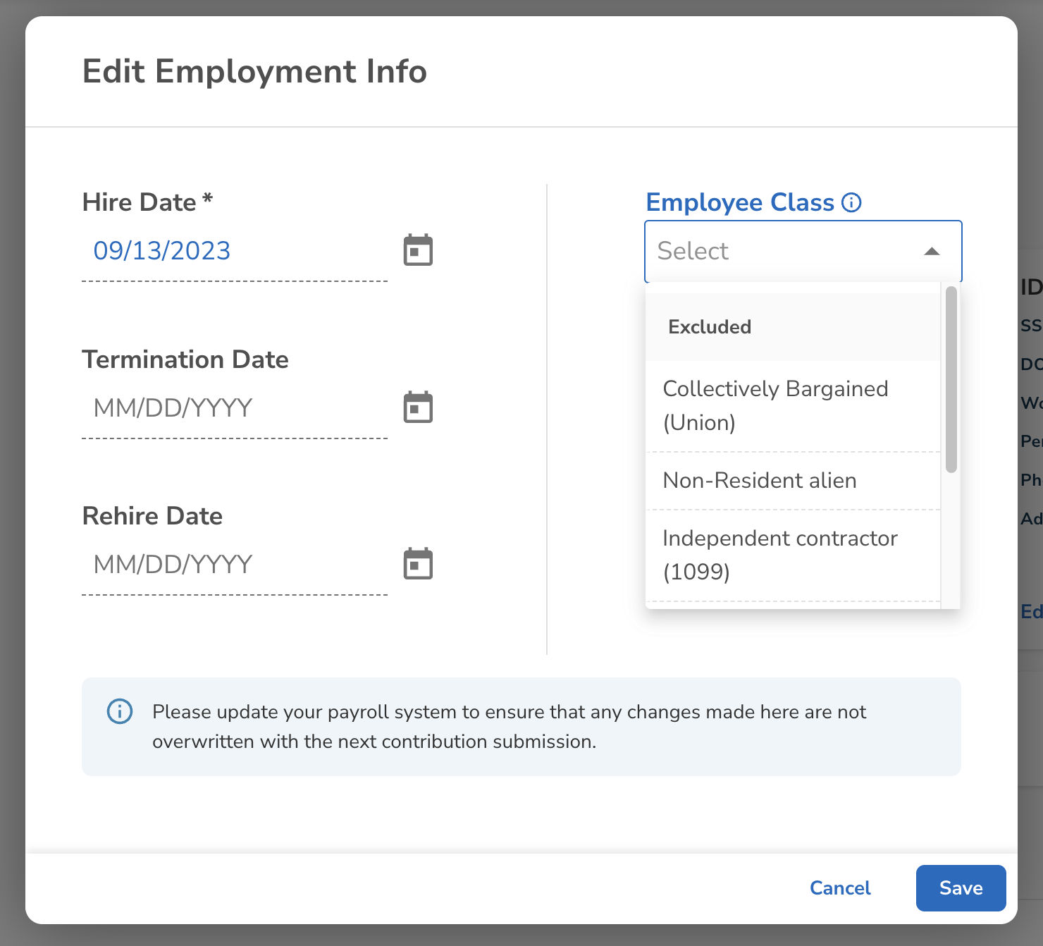 - A popup will surface, where you can input a classification in the “Employee Class” dropdown. Once you have made a selection, click Save.