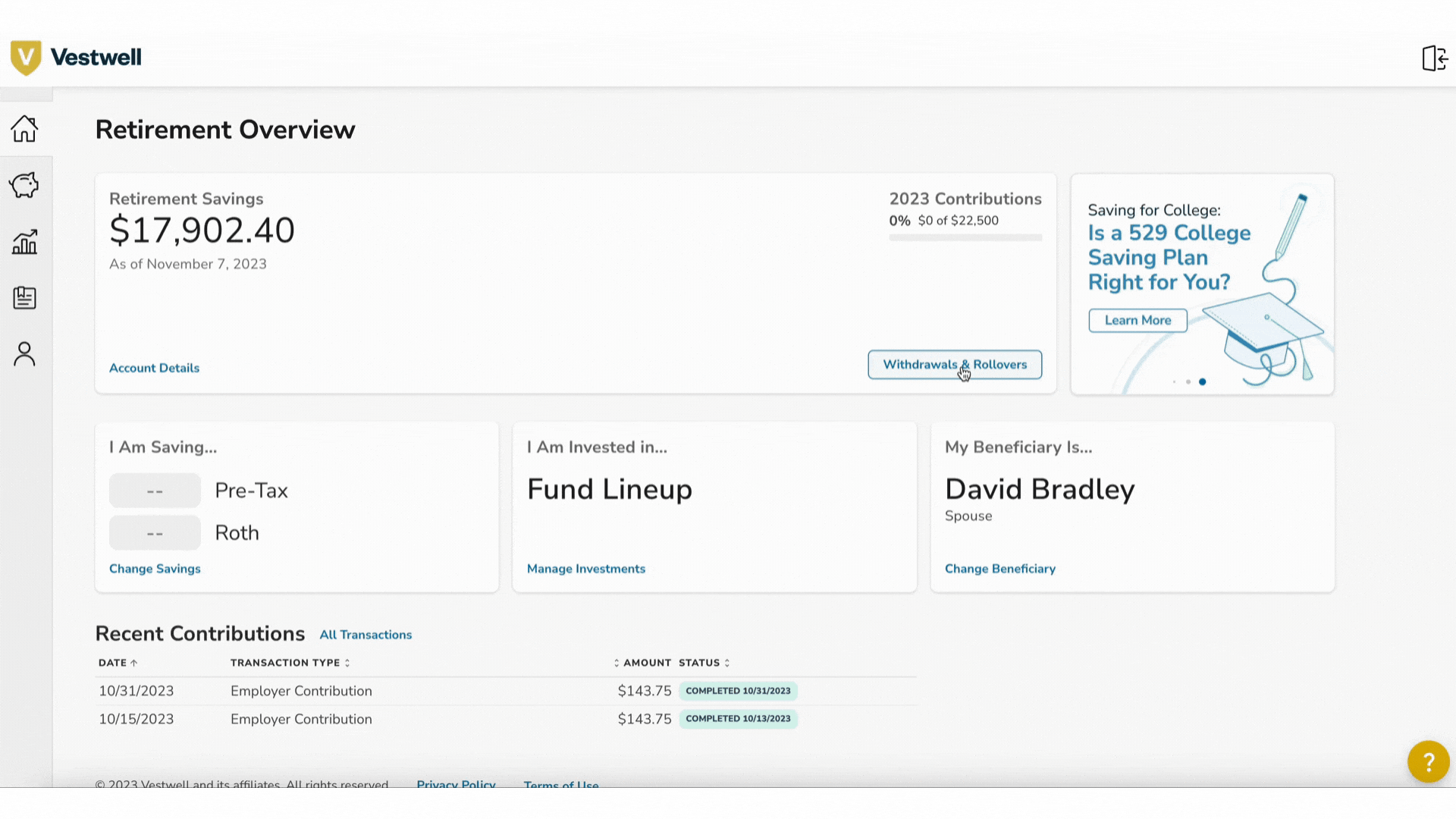 - Visit your "Retirement Overview" page and click Withdrawals & Rollovers. From the drop-down, select Withdraw from Balance. This will open a "Withdrawal Request" page.