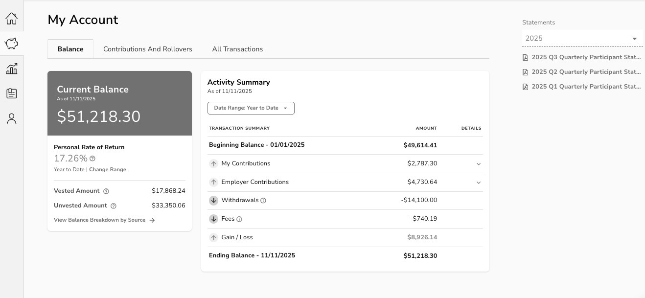 For a detailed view of all funds added to your account, including your personal and employer contributions, current savings rates, and rollover activity, visit the “Contributions and Rollovers” tab.