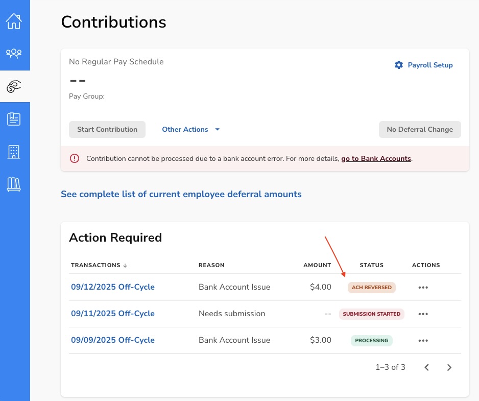 Once you complete the remediation steps and the bank account status updates to pending or verified, any blocked or held contributions tied to that account will automatically resume processing (unless a correction was previously made).